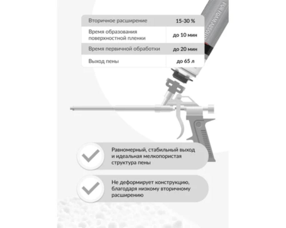 Характеристики: выход до 65л, вторичное расширение 15-30%, время плёнки до 10 мин, полимеризация 24-48 ч, плотность 10-20 кг/м³.