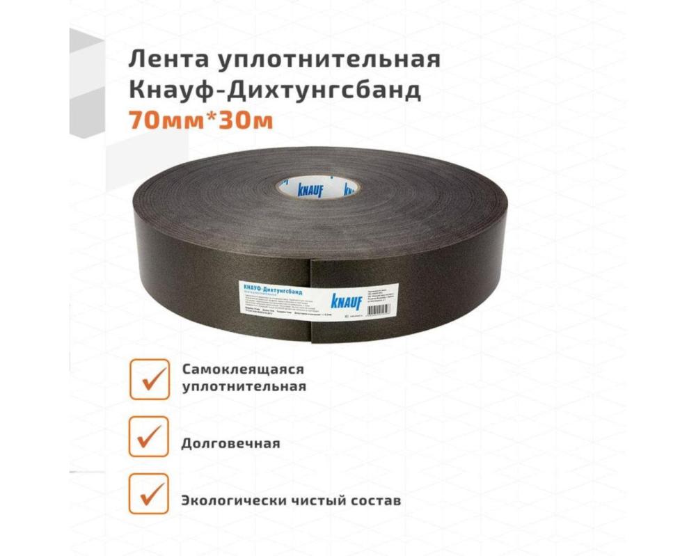 Уплотнительная лента КНАУФ-ДИХТУНГСБАНД 70мм×30м серая — самоклеящаяся, микропористая. Для герметизации стыков профилей. Защита от влаги, простой монтаж. Бесплатная доставка от 30тр по Сочи! Закажите сейчас на сайте или посетите магазин!