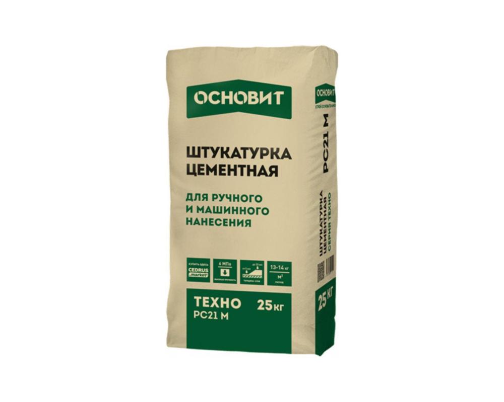Штукатурка ОСНОВИТ ТЕХНО РС21 М — цементная смесь для выравнивания стен при ручном и механическом нанесении. Фасовка: 25кг, цвет серый.