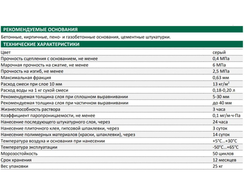 Технические характеристики: прочность при сжатии ≥6МПа, прочность на изгиб ≥2,5МПа, сцепление с основанием ≥0,4МПа, фракция 0,63мм, расход 13кг/м² при слое 10мм, жизнеспособность раствора ≥3 часа, морозостойкость 50 циклов.