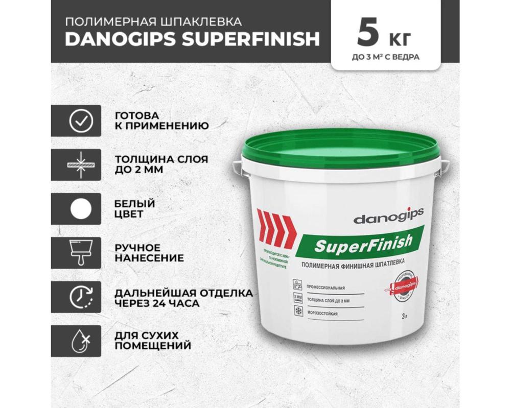 Готовая шпатлевка DANOGIPS PROMO Super Finish 5кг/3л — для внутренних работ. Толщина слоя до 2мм, время высыхания 24ч. Под покраску и обои. Бесплатная доставка от 30тр по Сочи! Закажите сейчас на сайте или посетите магазин!