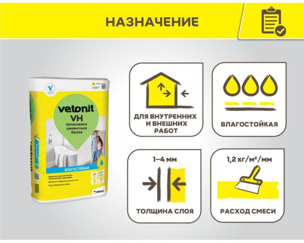 Шпатлевка VETONIT VH — цементная влагостойкая смесь для финишного выравнивания поверхностей перед финишной отделкой.