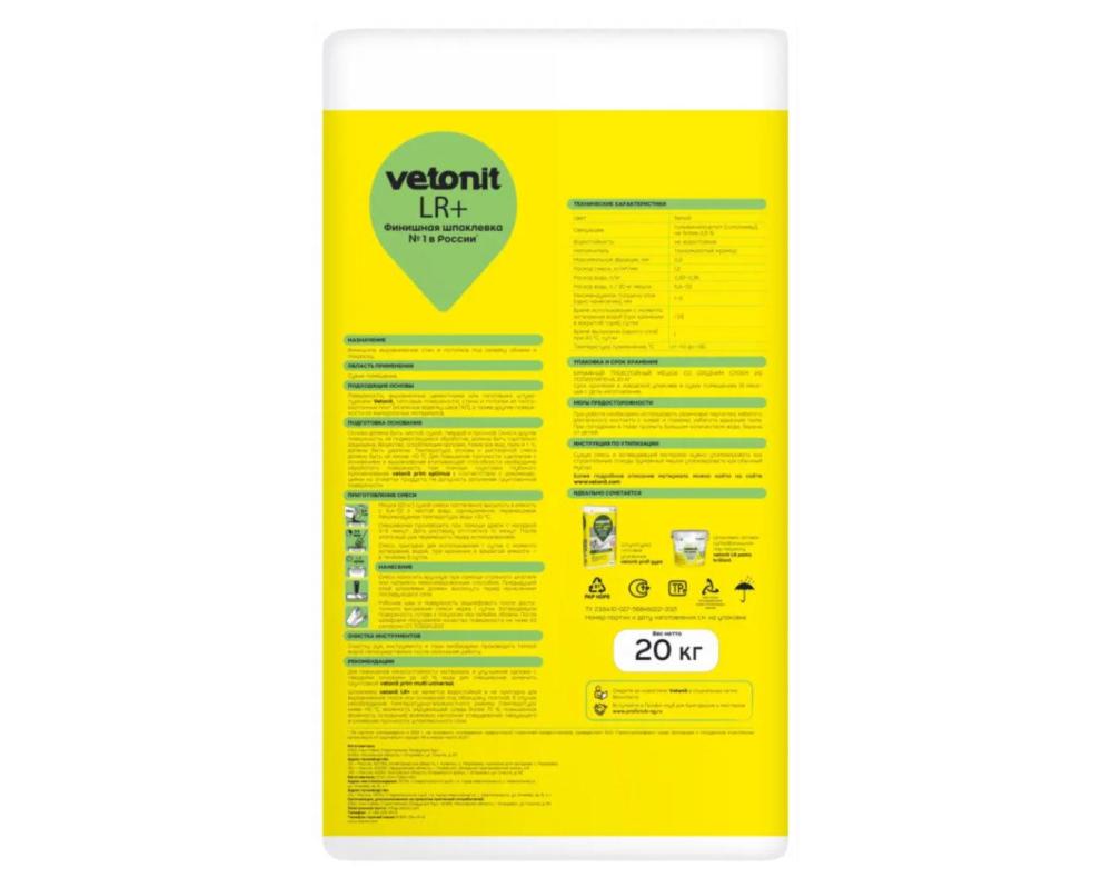 Шпатлевка финишная Weber Vetonit LR+ 25кг — профессиональная полимерная смесь для высококачественного выравнивания поверхностей.