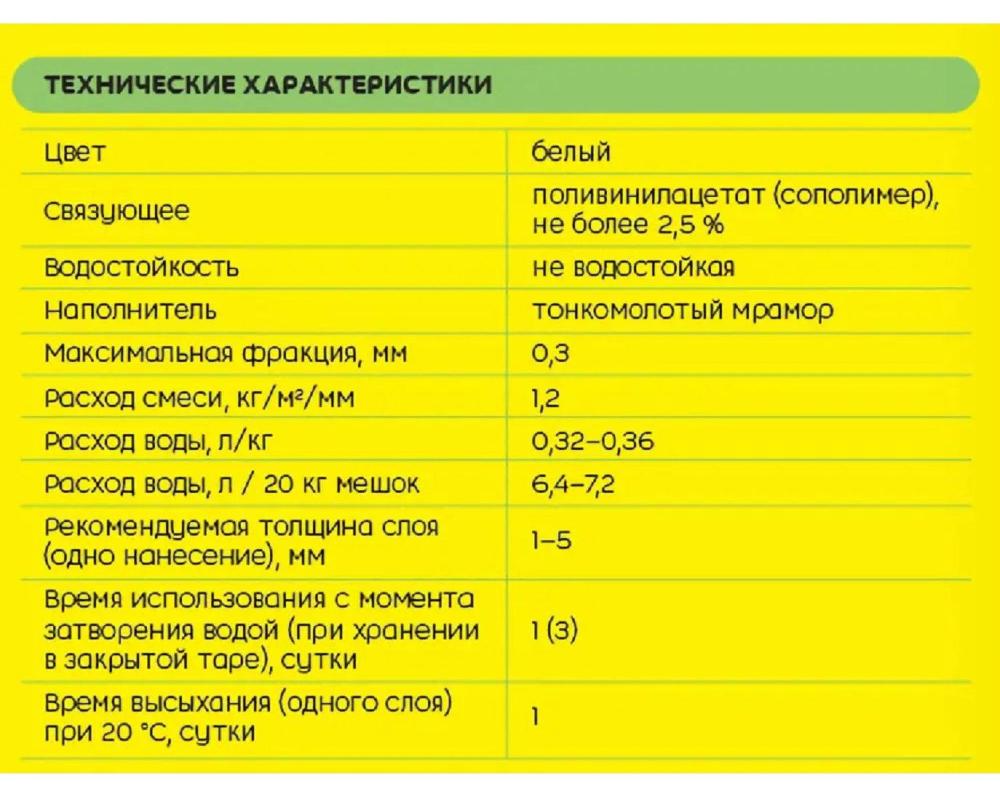Основные характеристики: расход 1,2 кг/м² при слое 1 мм, толщина слоя 1-5 мм, время высыхания 24 часа, температура работ +10°С до +25°С, фракция до 0,3 мм, жизнеспособность раствора 1-2 суток.