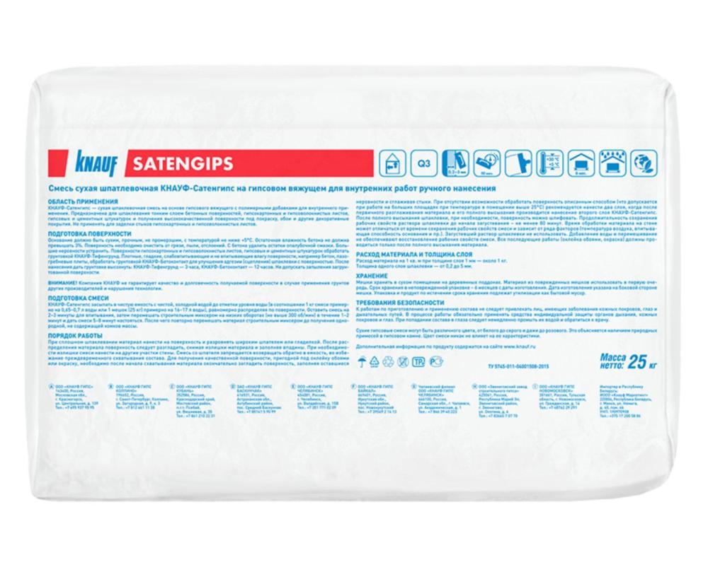 Гипсовая шпаклевка КНАУФ Сатенгипс 25кг — финишная смесь для внутренних работ. Экономичный расход, не трескается. Толщина слоя 0,2-5мм. Время работы 80мин. Бесплатная доставка от 30тр по Сочи! Закажите сейчас на сайте или посетите магазин!